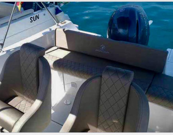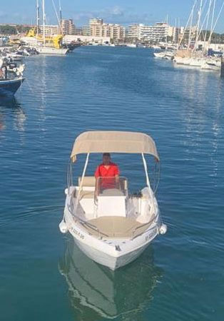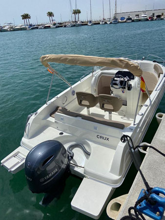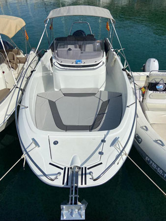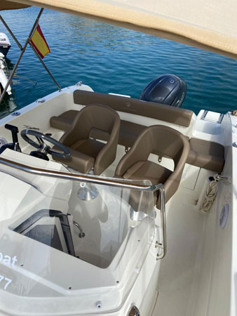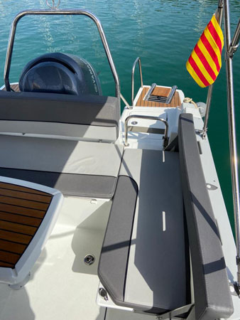 Lancha nueva de fácil manejo, muy espaciosa, agil y divertida. Amplio solarium en proa y pañol para guardar el equipaje. Parasol y ducha de agua dulce en popa. Altavoces bluetooth. Botiquín primeros auxilios y equipo de seguridad y salvamento. Ideal para costear y visitar pequeñas calas y el parque natural de las Islas Medas.