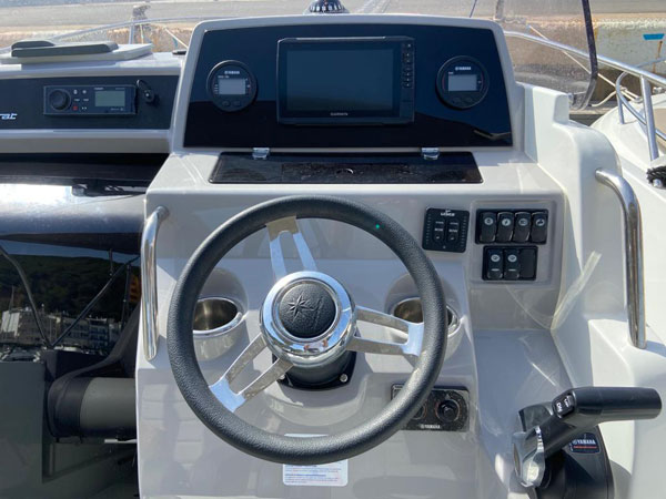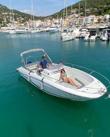 Lancha nueva de fácil manejo, muy espaciosa, buena navegación, muy segura y grandes prestaciones. Amplio solarium en proa y pañol para guardar el equipaje. Parasol y ducha de agua dulce en popa. Equipo de música. Botiquín primeros auxilios y equipo de seguridad y salvamento. Ideal para descubrir los mejores rincones de la Costa Brava y visitar pequeñas calas y el parque natural de las Islas Medas. Apta para deportes náuticos (sky, donut, wake….)