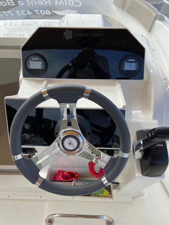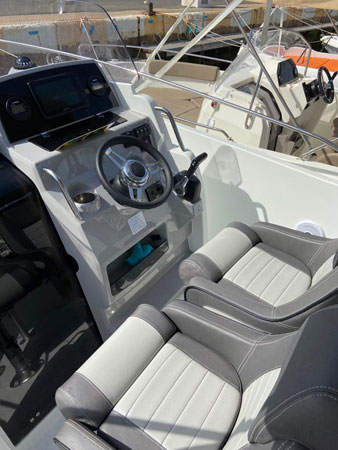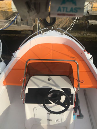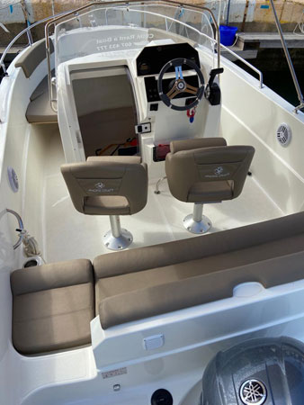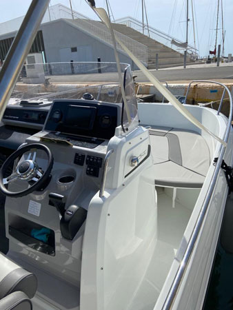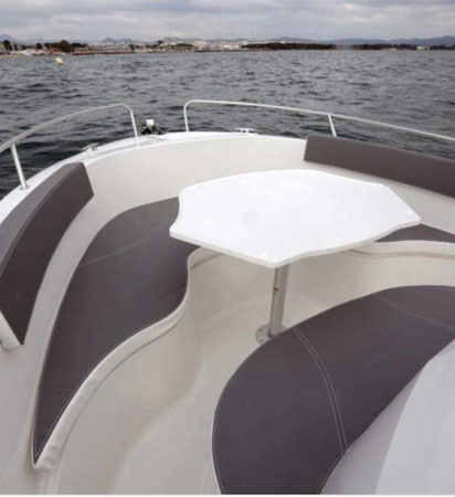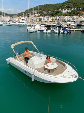 Lancha nueva de fácil manejo, muy espaciosa, agil y divertida. Amplio solarium en proa y pañol para guardar el equipaje. Parasol y ducha de agua dulce en popa. Altavoces bluetooth. Botiquín primeros auxilios y equipo de seguridad y salvamento. Ideal para costear y visitar pequeñas calas y el parque natural de las Islas Medas.